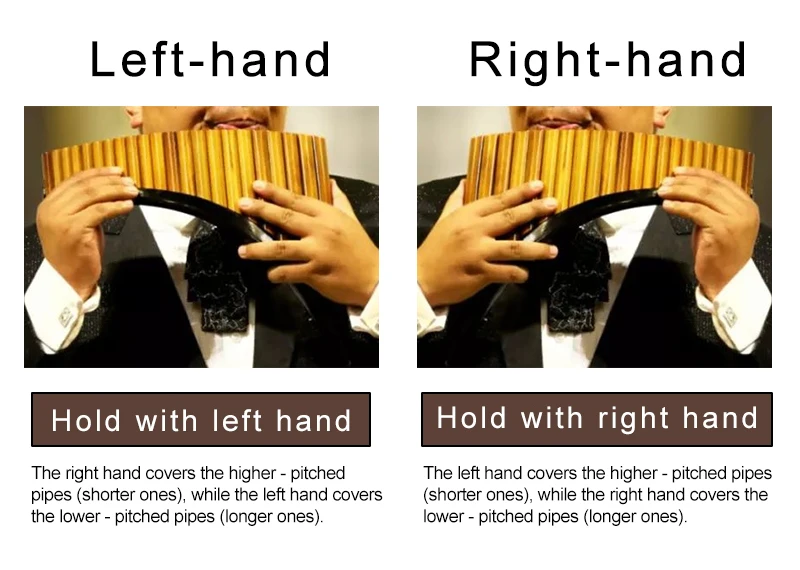 Quando você toca, o tubo mais longo da flauta de Pan fica à sua esquerda, ou seja, a flauta de Pan esquerda.Da mesma forma, a flauta pan direita